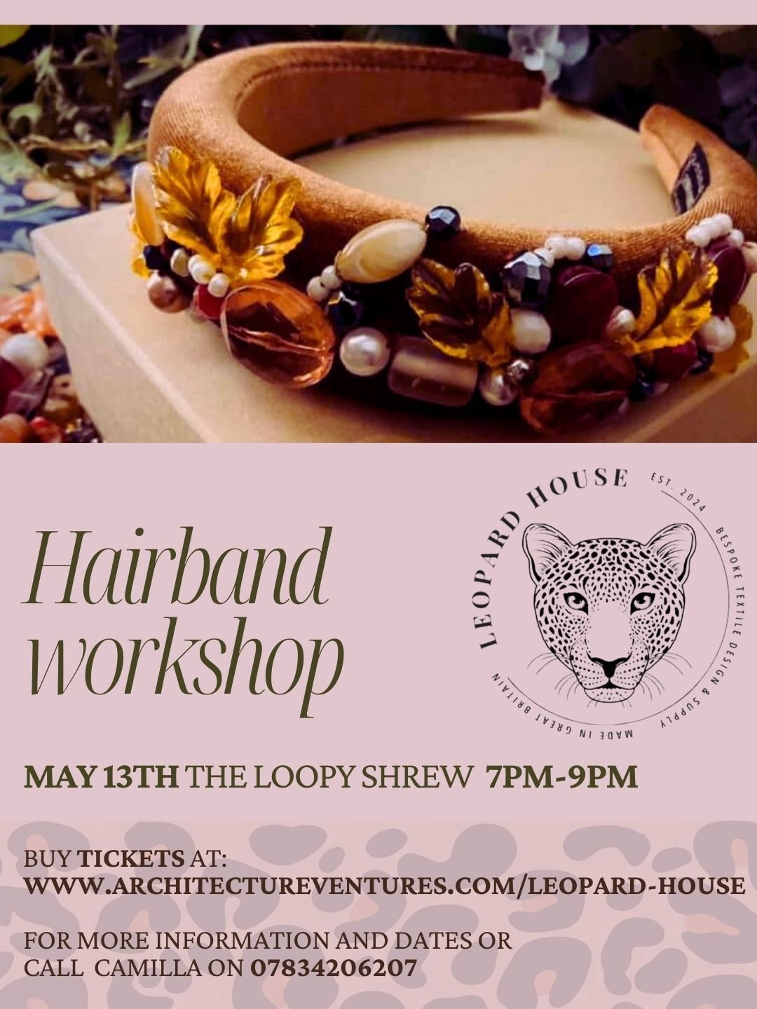 Leopard House Interiors is delighted to present a hands-on Hairband Making Workshop, perfect for anyone looking to create a stylish, handmade accessory. During the workshop, you will make your own hairband, with everything you need provided as part of the £25 ticket price. All tuition and materials are included, so no prior experience is necessary. Tea and coffee will be available throughout the session for you to enjoy as you create.